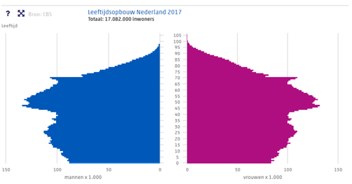 Als je kijkt naar het verschil tussen de bevolkingspiramide van 1990 en 2017 zie je dat er in 1990 veel minder oudere waren als nu, en er toen veel meer kinderen waren. Al die kinderen van toen zijn nu ouderen. En omdat ze nu verder zijn ontwikkeld met ziektes, blijven de meeste mensen langer in leven dan vroeger. Je ziet vooral dat er nu veel meer mensen zijn in Nederland als vroeger. Zoals ik net al zei komt dit doordat we nu meer zijn ontwikkeld in ziektes en we dus beter weten hoe we er mee om moeten gaan. Daardoor blijven mensen dus veel langer in leven. Dit zie je ook als je de sterftecijfers opzoekt. Dan zie je dat dat er nu dus veel minder zijn. Als je dan de geboortecijfers opzoekt, zie je wel dat er vroeger veel meer kinderen waren in een gezin als nu. Wel zijn er nu dus meer mensen die kinderen krijgen, omdat er meer mensen zijn in die leeftijdscategorie
