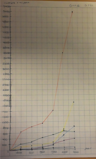 als je nog is kijkt naar de tabel op het tabblad bevolkingsgroei die hieronder ook weer staat, zie je dat in 2050 de bevolking bij de meeste landen omhoog gaat. Alleen bij de landen in Europa daalt het aantal inwoners. In de landen in Afrika stijgt de bevolking het meeste, namelijk met wel bijna 1000 miljoen inwoners. Je ziet dus dat in Afrika waar vooral de arme landen zijn er de meeste mensen bijkomen.